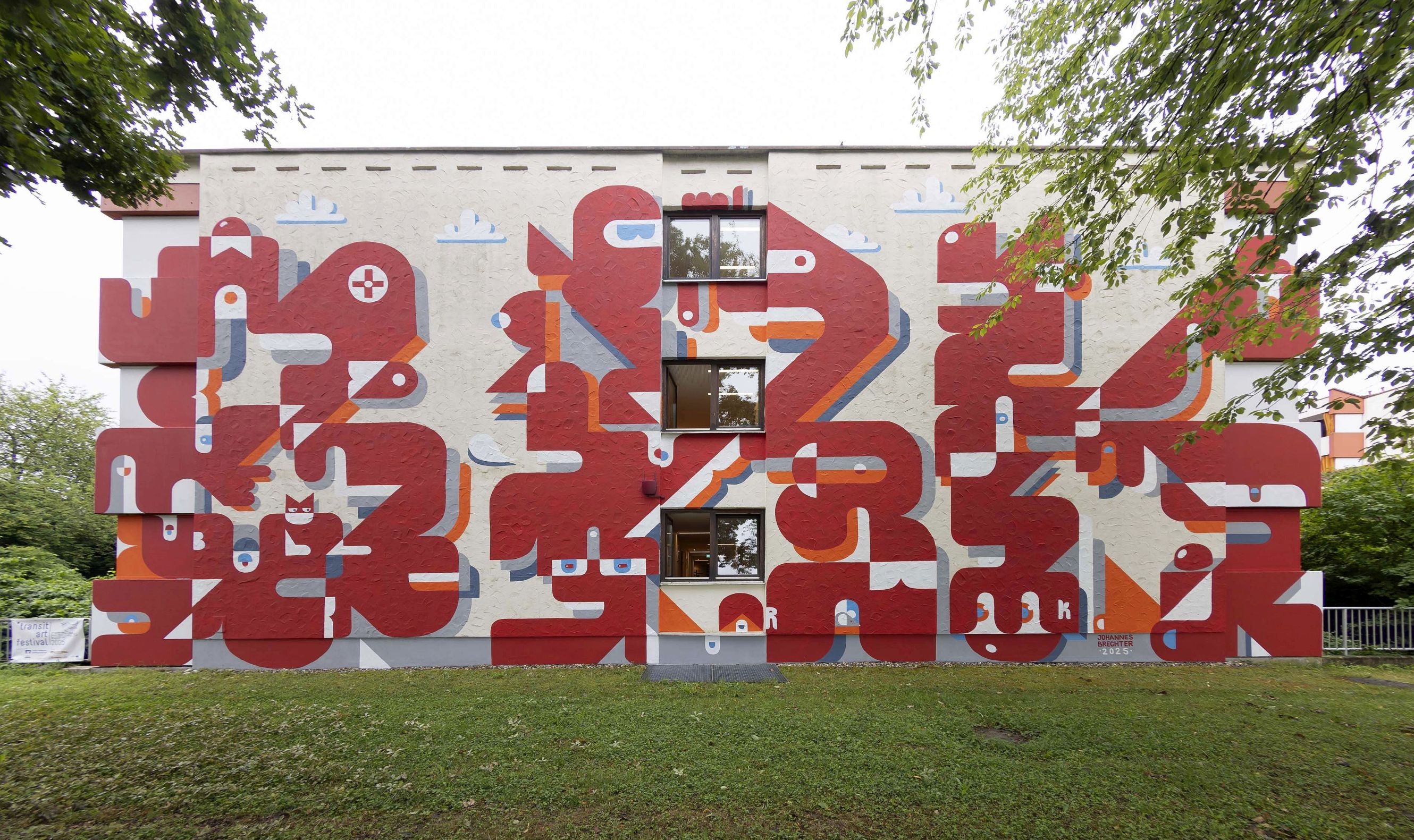 Johannes Brechter, geb. 1979, lebt und arbeitet in München. Vor seinem Studium der Bildhauerei an der Akademie der Bildenden Künste München, absolvierte er eine Ausbildung zum Schilder- und Lichtreklamehersteller. In dieser Zeit begann er Recycling-Materialien für seine Installationen, Kollagen und Skulpturen einzusetzen. Er entwickelte eine abstrakte Bildsprache, die Typographie und illustrative Elemente vereint. Der Ursprung seines künstlerischen Schaffens liegt im Graffiti und beeinflusst bis heute seine Studioarbeiten und Wandbilder im öffentlichen Raum. Für Rosenheim gestaltete Johannes Brechter 2023 das Wandkunstwerk „Pokal“ in unmittelbarer Nähe des Jahnstadions. 2025 begleitet der Künstler ein ganz besonderes Projekt: Gemeinsam mit Bewohnerinnen des Seniorenwohnheims erarbeitete er in einem mehrtägigen Workshop Motive für ein Wandgemälde, das er in der Festivalwoche an einer Fassade des Wohnheims umsetzte.