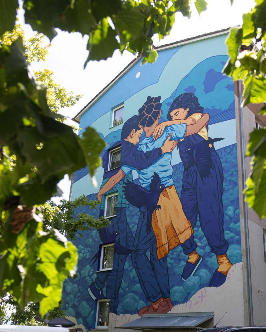 Die drei jungen, in Rosenheim aufgewachsenen Künstler*innen fanden im Kunstkollektiv zueinander. Während Transit Art 2021 gestalteten sie erstmals gemeinsam ein Mural, das die vielfältigen Verflechtungen in unserer Gesellschaft thematisiert.