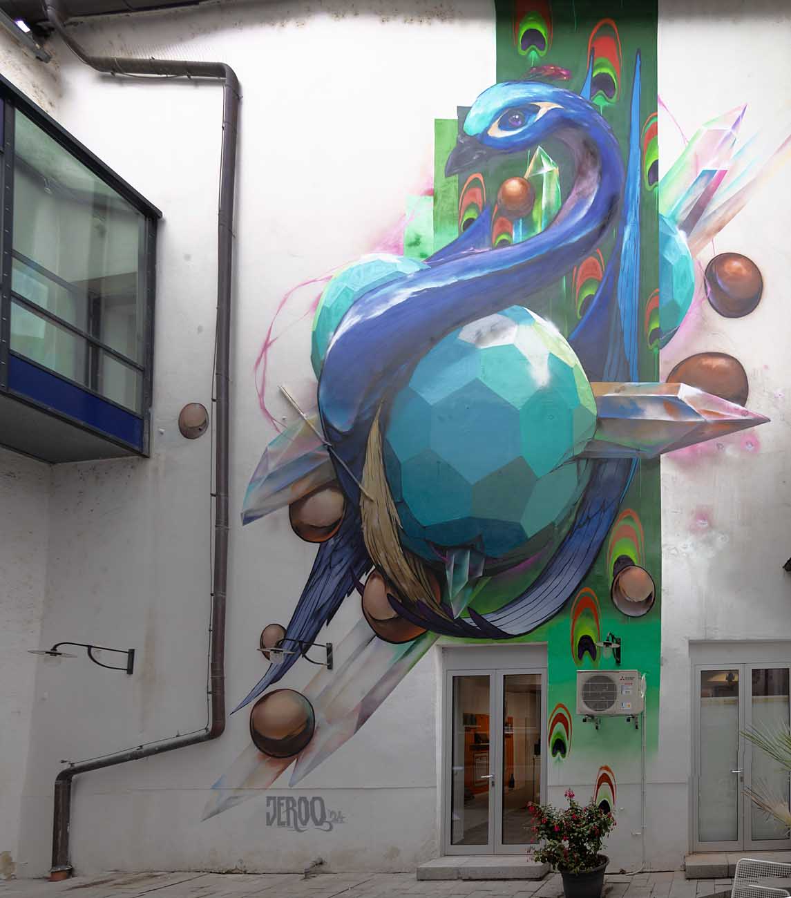 Der Stuttgarter Christoph „JEROO“ Ganter ist seit 1993 in der Street Art und Graffiti-Szene aktiv. Sein Stil ist harmonisch und dennoch dynamisch, immer auf der Suche nach der perfekten Verbindung zwischen Graffitikunst und der klassischen Ästhetik des Jugendstils. Neben seinen Werken im öffentlichen Raum widmet sich Ganter seit vielen Jahren auch der Malerei auf Leinwänden. 2013 verfasste er das erste umfassende Graffiti-Lehrbuch „Graffiti School“, das sich zu einem Standardwerk dieses Genres an verschiedenen Urban Art Festivals in Schweden, Frankreich, Spanien, Holland,der Schweiz und Irland mitgewirkt und sowohl für Marken als auch für Privatkunden Wandmalereien im Innen- und Außenbereich ausgeführt. Ihre Wandbilder sind geprägt durch eine ganz eigene Ästhetik und kombinieren Elemente der Natur mit geometrischen Figuren und Mustern. entwickelt hat. 2024 schuf Jeroo mit einem überdimensionalen Pfau ein im wahrsten Sinne des Wortes „fabelhaftes“ Mural im Innenhof des Städtischen Museums. 2025 kehrte er als Coach zurück nach Rosenheim. In einem mehrtägigen Workshop an der Mittelschule Westerndorf St. Peter gestaltete er gemeinsam mit Schülerinnen und Schülern ein Wandgemälde. Darüber hinaus hat er an der Schule auch ein weiteres, eigenes Kunstwerk entstehen lassen.