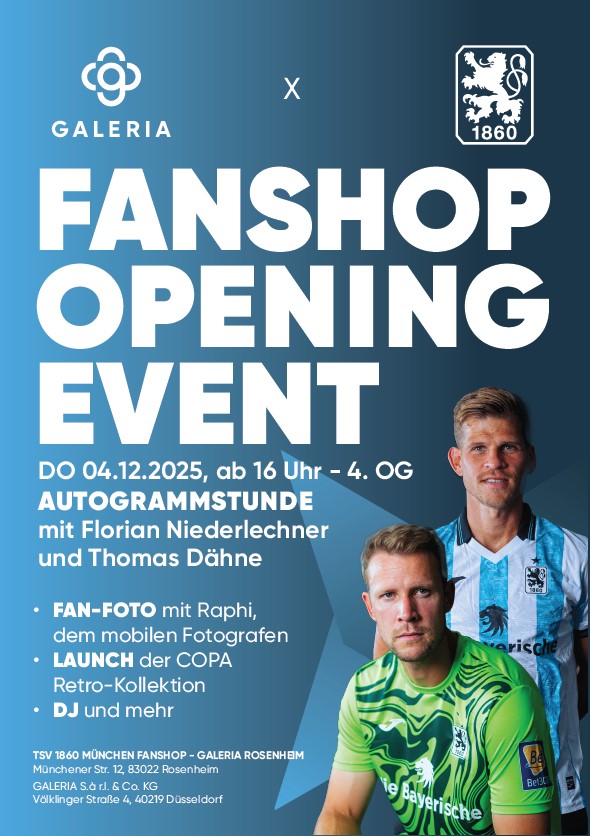 „Die Partnerschaft mit dem TSV 1860 München ist für uns mehr als ein Sponsoring, sie ist ein starkes Zeichen für die Verbundenheit mit der Stadt und ihren Menschen. Wir bringen zwei Marken zusammen, die für Tradition, Leidenschaft und Nähe stehen und schaffen damit echte Mehrwerte für unsere Kundinnen und Kunden, genauso wie für die Löwen-Fans“, sagt Sandro Ervens, Regional Sales Director Süd von GALERIA. „Diese Partnerschaft auf Rosenheim zu erweitern, macht uns sehr stolz.“ Dem pflichtet auch Jens Steinbrecher, Filialgeschäftsführer bei GALERIA Rosenheim, bei. „Wir freuen uns sehr auf die Kooperation mit 1860 München und möchten den vielen Fans in der Region eine einzigartige Löwen-Fanwelt präsentieren.“