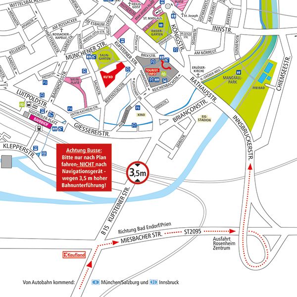Bitte die Anfahrtsskizze wegen der Höhenbeschränkung (Kufsteinerstraße) beachten und über die Umgehungsstraße (Miesbacherstraße) in die Stadt fahren.
